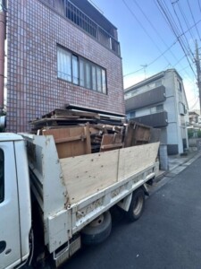 現場は住宅が密集した狭い路地にあり、大型車の進入が難しかったため、2tダンプ車を使用して対応しました。