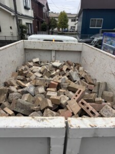 現場には撤去されたレンガやブロックが積み上げられており、そのほかにも庭の整地作業で出たコンクリート片などがありました。