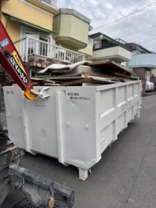 4tコンテナ車を使用し、扉やサッシ、木材、カーペットなどの混合廃棄物をまとめて積み込み。
