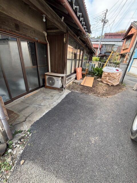 現場には、リフォームに伴って取り外された畳や木材、さらに解体時に出たガラス・陶磁器くずなどがまとまって置かれていました。