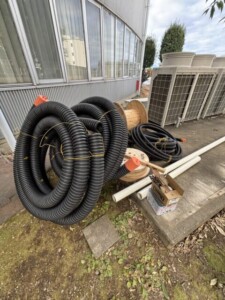 現場では、使用済みの木パレットがきれいに積まれており、他にも電材用のフレコン袋、樹脂ホースや配管などの副資材がありました。