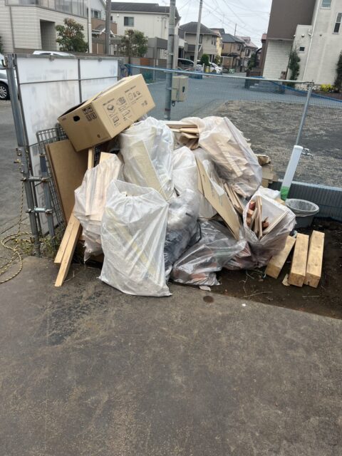 現場には、解体で出た瓦入りの土のう袋、木材端材、石膏ボード片、ダンボールなど、建築時に発生するさまざまな混合廃棄物が集積されていました。