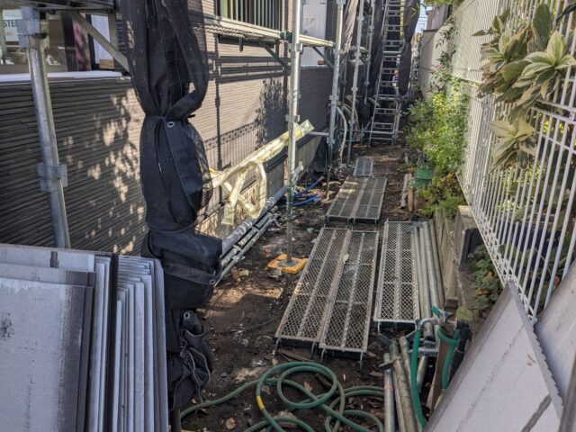 通路が狭く、周囲に足場材が組まれている状況でしたが、職人さんにお手伝いいただきながら、搬出・積み込み作業を実施。