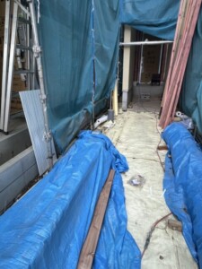 現場には、内装材の端材、梱包材(段ボール・発泡材)、ビニール袋にまとめられた細かな廃材、プラスチック部材などが通路沿いに並べて置かれている状態。