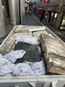 今回は、東京都渋谷区のテナントビル工事現場にて、4tコンテナ車を使用し、下ゴミ扱いのガラ(解体ガラ・モルタル片・コンクリート片など)の回収作業を行いました。